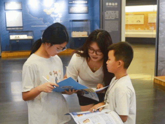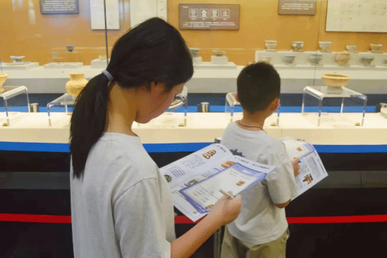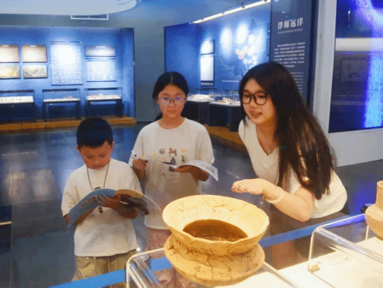 上午,在昙石山遗址博物馆中,艺术设计学院师生与青少年共同沉浸式追溯福建海洋文明的起源。他们聚焦馆内复原的早期海洋聚落场景,结合亲自设计的研学手册,引导孩子们了解先民渔猎、航海的生活;驻足遗址出土文物展区,细致观察陶器的纹理走向,揣摩古人制陶技艺与海洋生活的关联,进一步激发孩子们对海洋文化的浓厚兴趣。